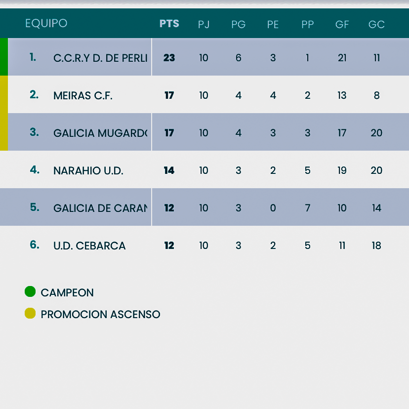 Por otro lado, queremos reconocer el gran trabajo del Galicia de Mugardos «B» y del Meirás CF por haber logrado clasificarse para los playoffs de ascenso. Les deseamos mucha suerte en esta nueva fase y esperamos que puedan conseguir sus objetivos.
