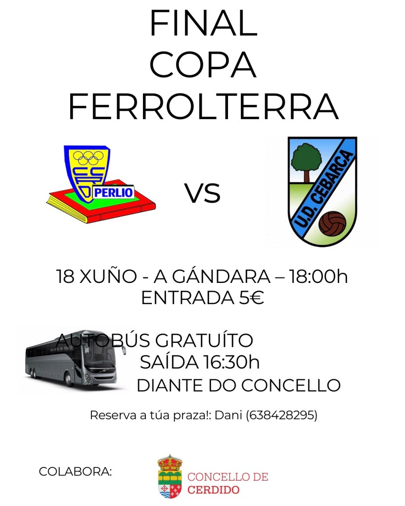Si estás interesado en asistir, contáctanos a través de Dani al 638428295 para reservar tu plaza en el autobús. ¡No te pierdas la oportunidad de apoyar al Cebarca en esta gran final! Agradecemos al Concello de Cerdido por su patrocinio y apoyo en esta iniciativa.