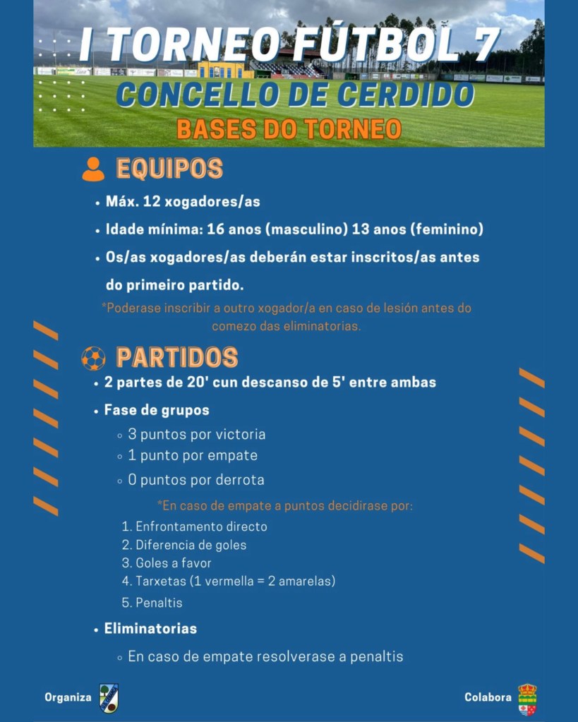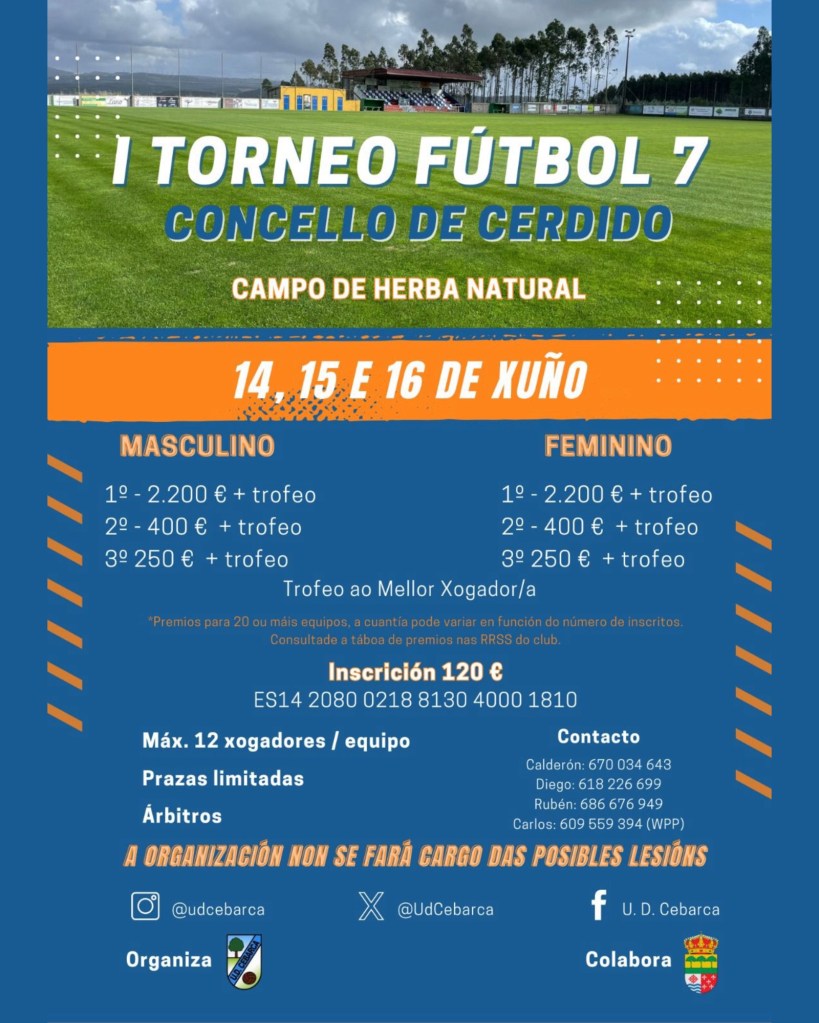 O verán está á volta da esquina, e con el chega o I Torneo de Fútbol 7 Concello de Cerdido, unha festa para os amantes do deporte rei. Este evento, organizado pola UD Cebarca co apoio do Concello de Cerdido, celebrarase nos días 14, 15 e 16 de Xuño no noso querido campo de herba natural, o Municipal Bernardino Breijo.