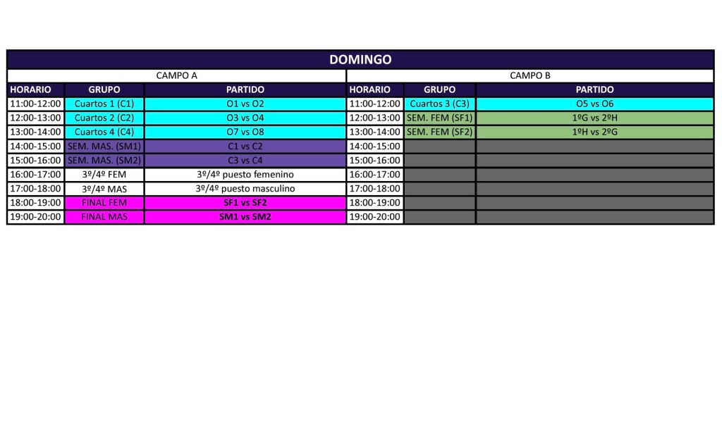 • Los cuartos de final comenzarán a las 11:00, seguidos de las semifinales tanto masculinas como femeninas. Los partidos por el tercer y cuarto puesto se jugarán por la tarde, culminando con las finales femenina y masculina a las 18:00 y 19:00 respectivamente.