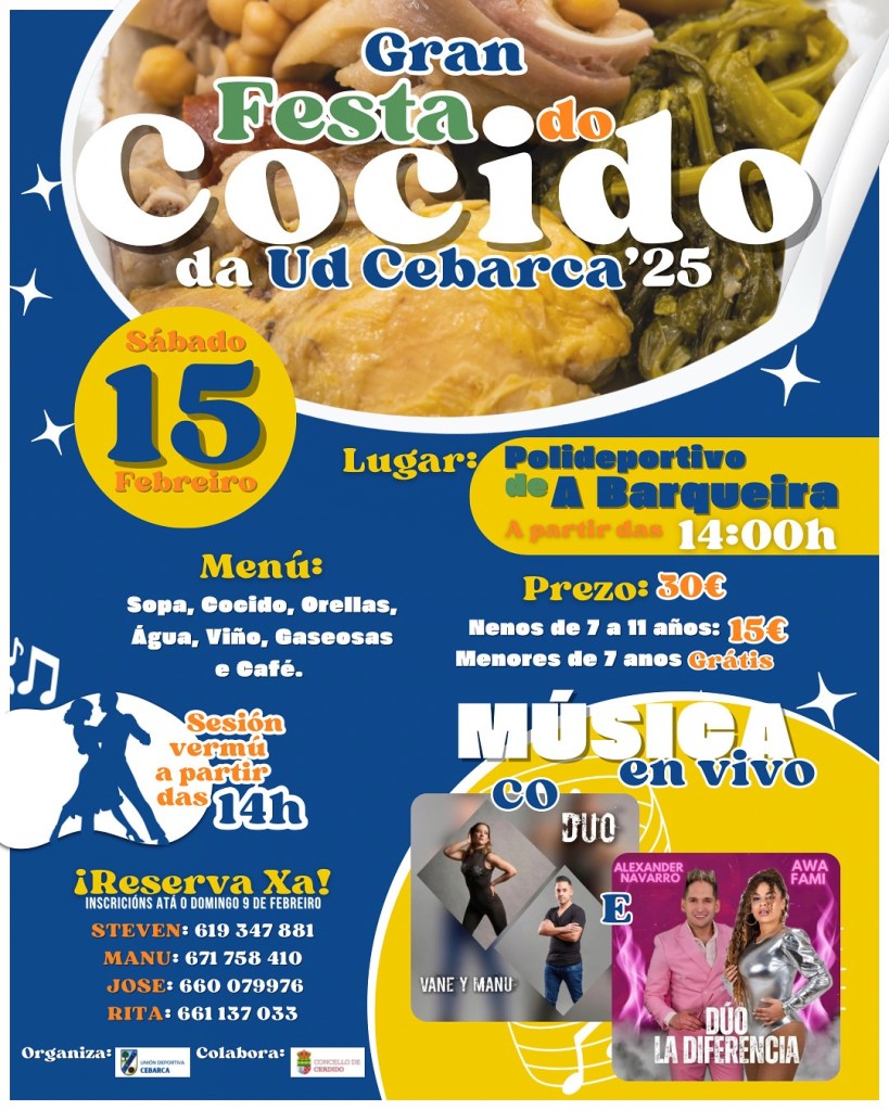 Non te esquezas de facer a túa reserva antes do domingo, 9 de febreiro! É unha oportunidade perfecta para disfrutar dum bo cocido, da música e da boa compañía.