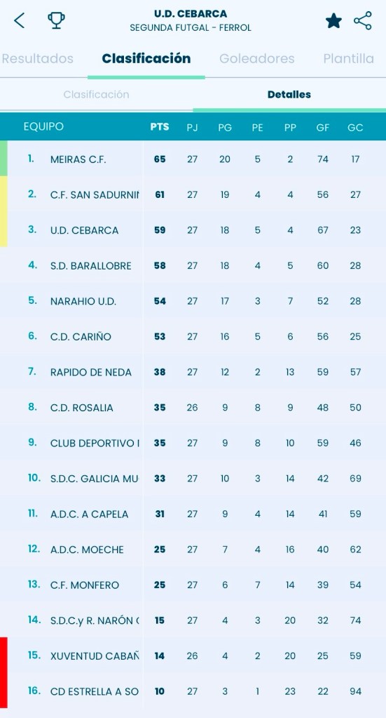 Con esta vitoria, a UD Cebarca suma 59 puntos e sitúase terceira, a dous do segundo posto (San Sadurniño, 61) e a seis do líder Meirás (65). Por detrás, Barallobre (58), Narahio (54) e Cariño (53) seguen presionando. A igualdade é máxima e os duelos directos destas últimas xornadas serán decisivos.