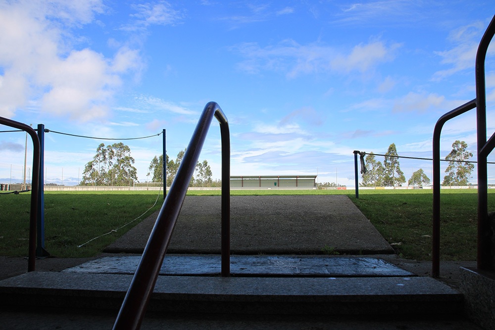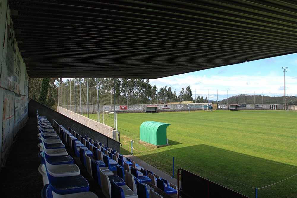Terreo de xogo de herba natural Bancos e zonas técnicas Dúas gradas para o público Entorno próximo e familiar.